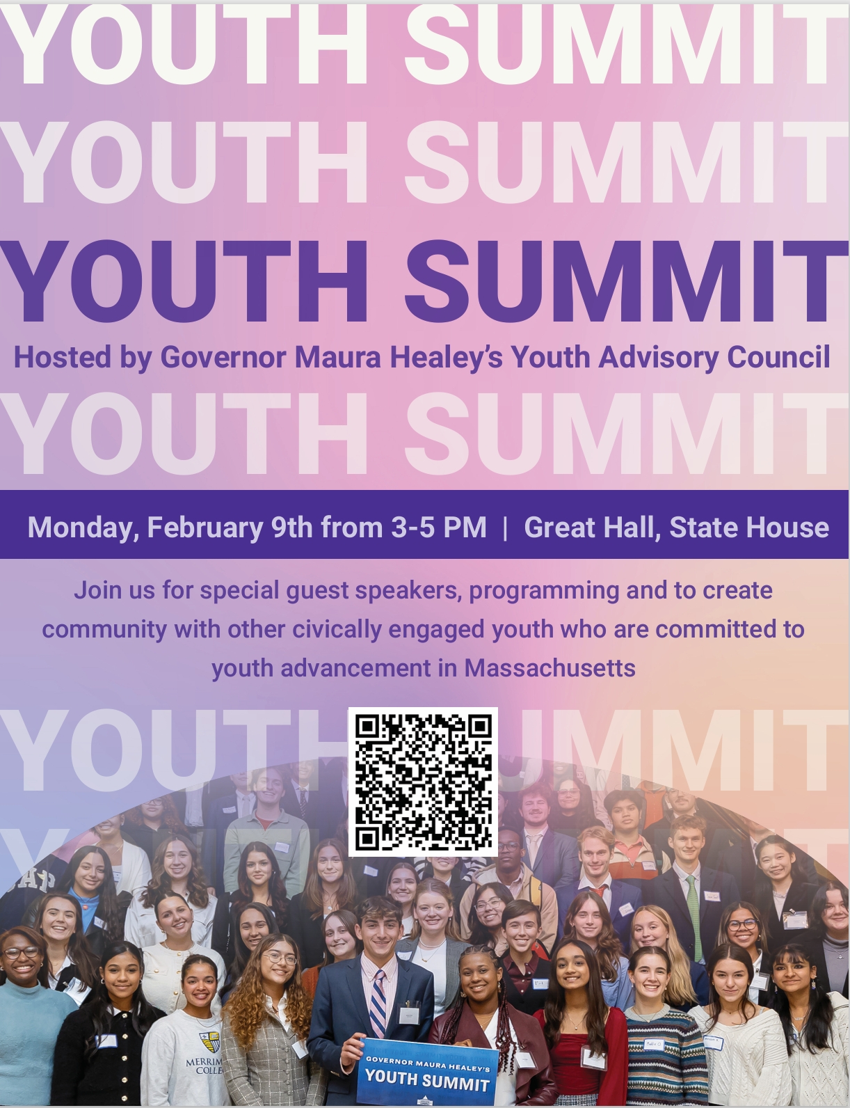 The Governor’s Youth Advisory Council would like to invite youth ages 16-20 to Governor Healey’s second annual Youth Summit, held on Monday, February 9th, at 3:00 pm, in the Great Hall of the Massachusetts State House. The summit will provide a valuable opportunity for young leaders across the Commonwealth to come together and discuss important topics concerning youth, including mental health, education, and healthcare.