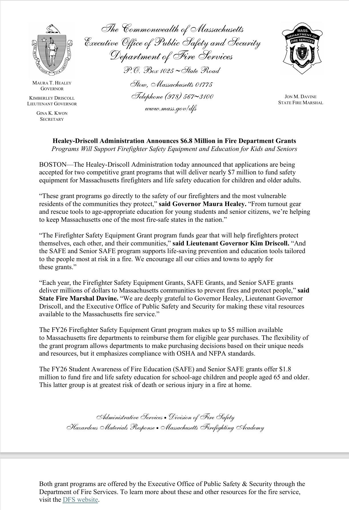On behalf of the Healey-Driscoll Administration, the Executive Office of Public Safety & Security (EOPSS), and the Department of Fire Services (DFS), we are pleased to announce the availability of $6.8 Million in Fire Department Grants.